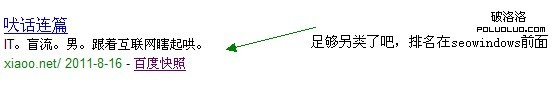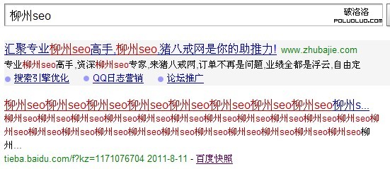 朋友們搜索一個seo地方站”柳州seo”,你會發現標題是用目標關鍵詞堆砌而成,然而排名穩居老大,當然也許你會說這個很正常,你會說百度對冷門詞堆砌的算法機制還不是很成熟,但我想下面的另類排名值得深思。