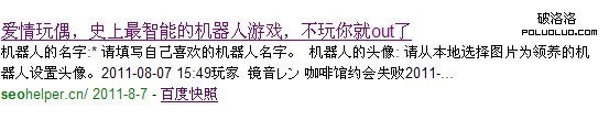 也許你看到以上排名情況會說別人網站權重高隨便在標題或者描述中帶上seo這個關鍵詞就排名上去了,對一般的關鍵詞筆者表示同意,但分析一下seo這個詞的競爭度後筆者表示沉默。再看以下網站標題我想你會和筆者一樣沉默(與seo風牛不相及的網站)。朋友百度搜索seo,看排名第六頁的”愛情玩偶,史上最智能的機器人游戲,不玩你就out了”: