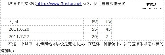 網站缺乏變化,無疑是一個死結,就算外鏈做的不錯,網民訪問一下就跳出去了,沒有形成多大的點擊率,也就是PV值。所以不管是獨立訪問個體UV還是點擊量PV都實際處於一個比較尴尬的境地,網站進行關鍵字優化沒錯,但此時你就要反思一下什麼樣的關鍵字才是比較好的關鍵字。