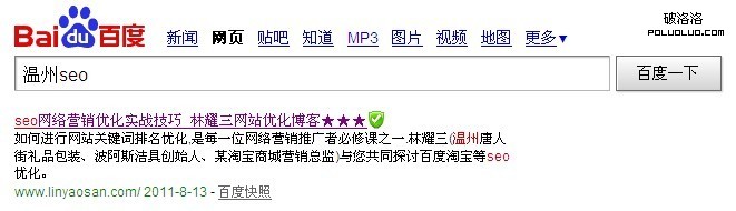 上半年SEO,猶如三國演義,一方唱罷,一方登台。狼雨的崛起,利為匯的沒落,唯有SEOWHY基業長青。自己在做溫州seo這個詞的時候,也是因為無意中百度一下,沒想到大部份的站都是出自利為匯學員之手,而且一級域名明顯增加了很多,指數也從幾十飙升到現在的二三百。也許中國人就是這樣,玩的人多了便想湊進去,看看熱鬧,就這樣也開始自己的溫州seo排名之旅。看到大多數人都是用個人博客,而且都是新域名,為了避免太多的竟爭優勢,就用自己注冊不久的個人域名開始操刀,也洽好給自己做個人博客的理由,因為域名注冊好幾個月也沒整上。下面簡單的說說如何在三個月關鍵詞上百度第一,老鳥就走吧,新手可以參考下,在個人的奮斗路上共勉: