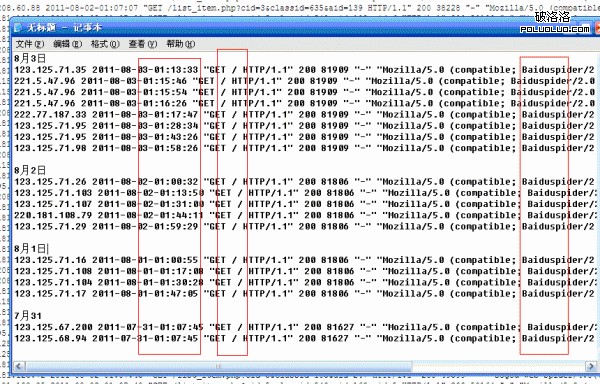 日志文件能很好的幫助我們去了解百度蜘蛛的動向,從中可以看到百度蜘蛛之前爬行網站,每個小時只光顧首頁1-2次。這樣的頻率對於時時在更新的站來說,遠遠不夠,這也是百度快照停止更新症結所在。找到原因就對症下藥,其實前鋒並沒有做太多的事,所有目的只圍繞一件事做:蜘蛛前來爬行首頁。剩下的就是具體怎麼引導了。下面是我截取的7月31號到8月3號的服務器日志文件:
