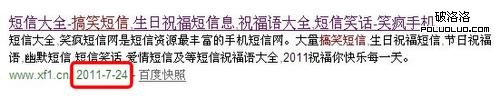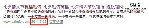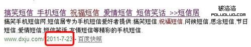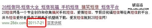 百度算法改變,很多網站快照都是停滯不前,通過自己的短信網站分析來看,快照從7月27號開始就不更新了,也許27號是一個百度的大更新,快照倒退到21號後,就一直停滯更新,通過短信類的網站分析來看,不僅僅是自己的網站有這個狀況,其他的短信類排名首頁前幾位的快照也是更新得很慢: