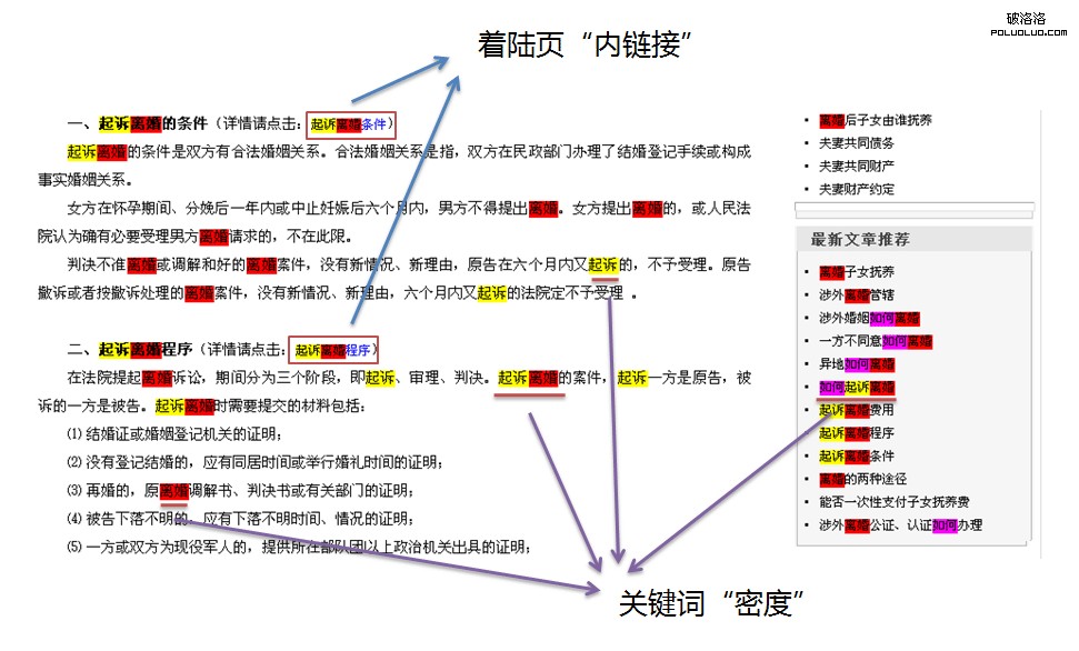 1) 隨便點開幾個著陸頁、都可以看到“(詳情請點擊:起訴離婚條件)”這種字樣、隨著“關鍵詞”的出現、都做了內部鏈接、而鏈接過去的頁面、不緊緊與關鍵詞高度相關、同樣是這個“關鍵詞”的著陸頁。