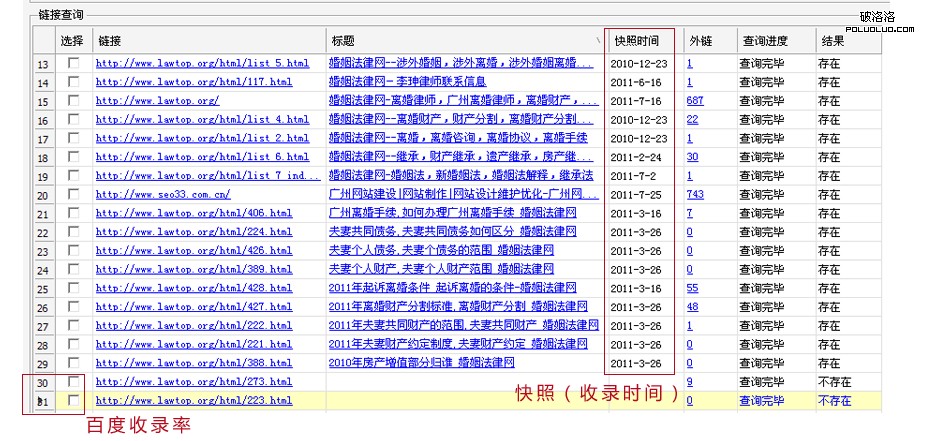 著陸頁“導出鏈接”收錄率、 從第1部分析、我們得出導出鏈接總數量為34個,而目前收錄29個、也就是說只有4個頁面未被收錄! 而從百度快照部份、同樣猜測到每個頁面的收錄時間或者說SE對頁面的最後一次更新時間。