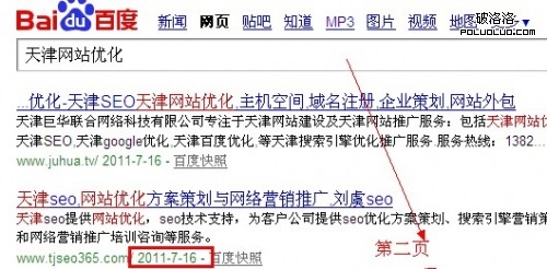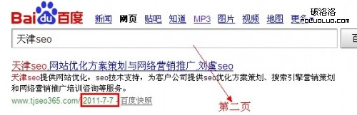 為了進一步分析問題所在,我又百度搜索“天津網站優化”,但是這個關鍵詞排名的百度快照沒有發生變化。