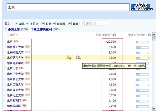 三,利用錯別字分析法對長尾關鍵詞進行分析。網絡的發展包容了不同文化程度的人,再加上輸入法的局限。那麼出現錯別字的關鍵詞組合在所難免。當一些關鍵詞具有一定的檢索量並且這些關鍵詞容易出現錯誤的時候,那麼錯誤的關鍵詞也會具有一定的檢索量。可以利用這個方法來對關鍵詞進行分析和統計收集。