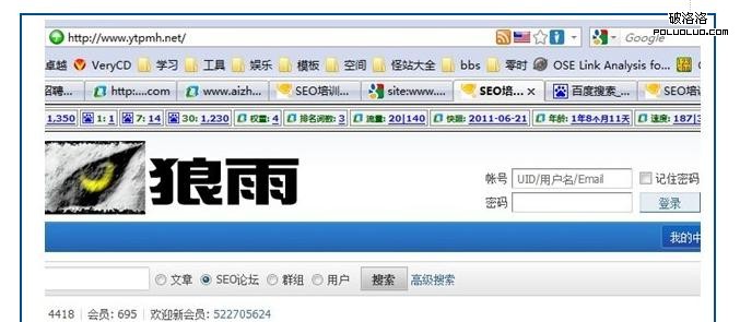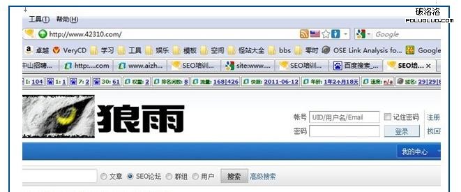 第一步:“site:狼雨域名 -SEO”,這個大家應該懂吧?“-SEO“就是百度收錄的狼雨網站不包含SEO的頁面。通過SITE,我們發現了什麼?沒錯,這個站以前是做的一個“網賺論壇”。其實我老早就認識狼雨了,也拜訪過他的QQ空間,那時候通過它的QQ空間了解到,他正在做“網賺”這個詞。所以他手裡的域名全部做的“網賺類”網站。現在他做關鍵詞“SEO”,又把自己的網站全部改成了“SEO”相關的網站。像這種對新站經常修改title和meta的做法,我說不會被K,你信嗎?