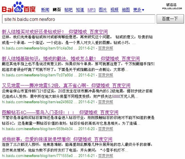 我知道有一些朋友也提到過百度空間不給收錄的問題,不知道這些朋友是不是也用的中文注冊名。反正我是覺得問題出在這裡了,於是我當機立斷,放棄了中文注冊名的百度空間,另外注冊了一個英文注冊名newforo的百度空間,剛剛注冊的當天立即發表了一篇文章,那是一篇從原來中文注冊名的百度空間轉載過來的,只改了個標題。十幾分鐘後,我查詢文章收錄:site:hi.baidu.com newforo,赫然發現這篇文章已經被百度收錄。第二天我又發了4篇文章,百度又很快收錄了。而反過來看那個中文注冊名的文章收錄情況,我特意一篇篇地按照標題查找收錄,愣是一篇也沒有被收錄。由此可見,百度對於自家產品百度空間確實是很親的,只是你應該選擇英文注冊名來開通空間,而不是用需要解析的中文注冊名。