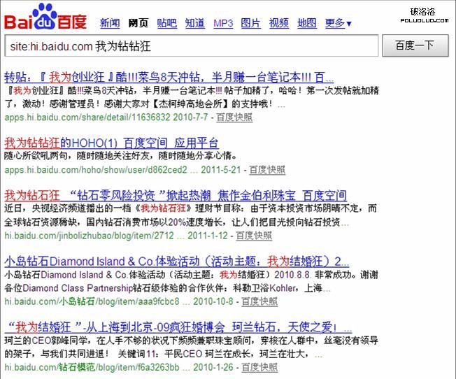 我當初注冊百度空間時用的中文注冊名“我為鑽鑽狂”,於是百度給的空間博客域名便是http://hi.baidu.com/我為鑽鑽狂,按照以上的方法,我們應該這樣查詢:site:hi.baidu.com 我為鑽鑽狂,可是結果是杯具的一篇收錄也沒有。為什麼會這個樣子,你可以看看你的中文博客浏覽器的地址欄便會發現,那裡顯示的地址已經將中文解析成了一串亂碼,哪怕是收錄了你的文章,地址也會是hi.baidu.com/亂碼/文章頁,而不會是hi.baidu.com/中文注冊名/文章頁。看到這裡,有人會想,那麼我查詢的時候用亂碼代替中文注冊名不就好了?我也是這麼想,可是同樣查詢不到有收錄。於是我猜測,由於中文注冊名被解析成了亂碼的緣故,會不會被百度認為是不友好的動態地址而不給收錄呢?哪怕是百度自己的產品也是毫不留情。