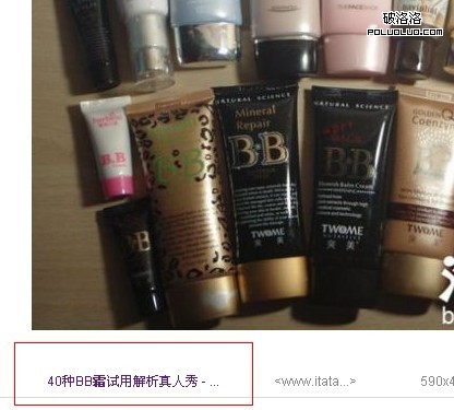 既然搜索引擎無法很好的識別圖片,那麼我們就來幫助他,在alt和title都齊全的前提下,在圖片底部我們再來配一些文字描述,這段文字要盡可能的重復alt和title裡的關鍵詞,比如標題是“40種BB霜試用解析真人秀:然後第一張圖片的alt描述是“美寶蓮BB霜試用解析真人秀”,然後在圖片下面寫一段文字圍繞著“40種BB霜試用解析真人秀”,這樣這個搜索引擎就把“BB霜試用解析真人秀”這個詞和這張圖聯系起來了,圍繞著這個詞的分詞也可能有很不錯的排名。