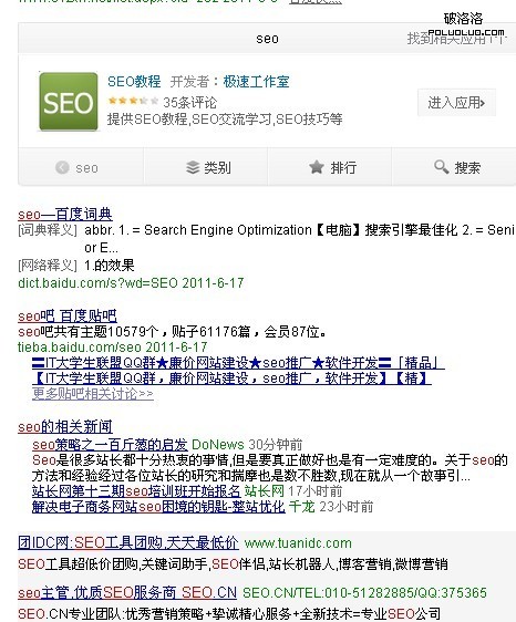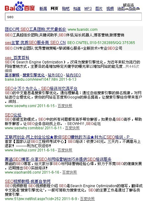 百度正在一步一步走向站內搜索。不多說了,我們看下競爭激烈的詞“SEO”今天在百度的所呈現的搜索結果,有圖有真相!
