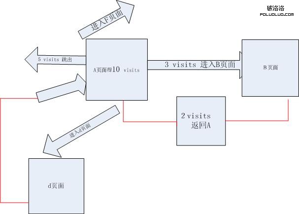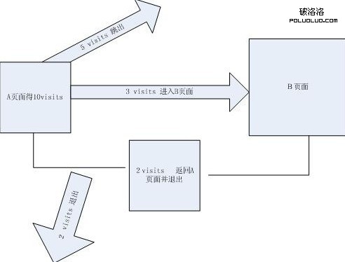 10個visits來到a頁面 ——5個visits直接離開,3個visits去b頁面 (2個visits去c頁面然後直接離開)。 b頁面的3個visits有2個visits返還a頁面最終從a頁面離開。