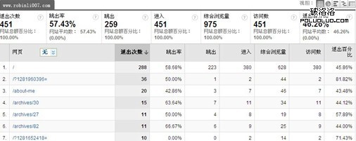 退出率,退出數是 451,綜合浏覽量pv是975,計算退出率就是451/975≈0.46256,忽略小數點就是46.26%