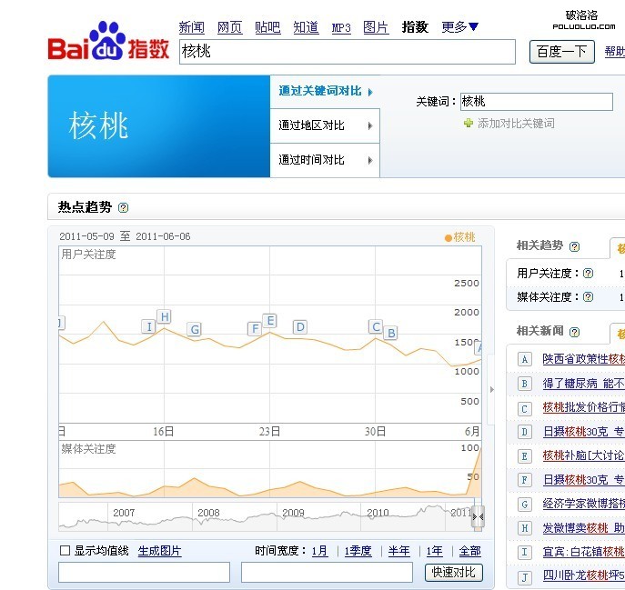 三、通過百度指數來了解相關關鍵詞的搜索量,通過這個可以很直接的知道您所需要確定的關鍵詞是否熱門,是否有一定的搜索量,咱們還是以核桃這個詞語來舉例。如下圖所示: