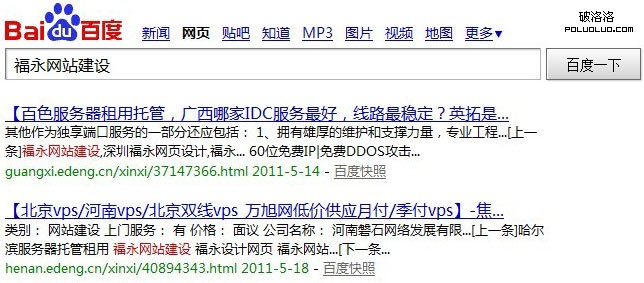 在上圖中出現在三條網頁信息的第一條是做了百度推廣鏈接的除外,下面的兩條均是百度快照,上一條的簡要說明中關鍵詞出現了兩次,而下一條則只出現了一次,,兩次比一次多,所以上一條排到了下一條的前面。