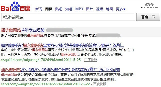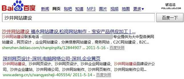 先談談影響排名的關鍵詞的位置因素,在搜索結果中關鍵詞的位置通常出現在兩個地方,一個是出現在title標題中(title就是快照的第一行 大字體的那一句話,一個是出現在簡要說明中(簡要說明就是快照的第二行與第三行小字體的那一段內容,通常這部分內容是搜索引擎索引的網頁body標簽內內 容當中的文本內容),為了能夠證明關鍵詞出現的位置對排名也有影響的,我們可以搜索“沙井網站建設”這個關鍵詞的排名結果來證明這個觀點,下圖是搜索的結 果截圖。