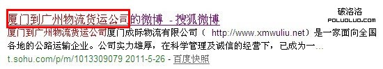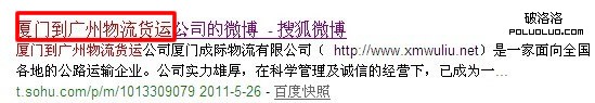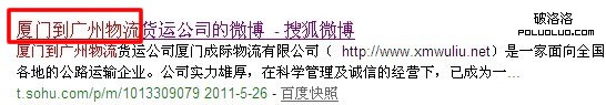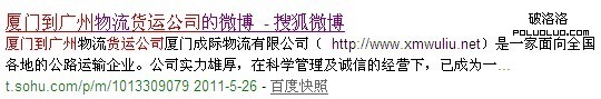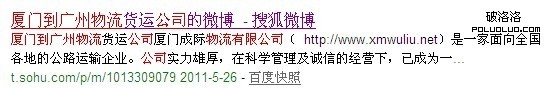中文分詞原理對於站長朋友應該都非常熟悉不過了,簡單的一句話可以分割成好幾種形式,從而讓更多的關鍵詞有排名。從搜狐微博做關鍵詞排名實驗來看,它同樣遵循中文分詞的原理,首先在搜狐微博注冊一個帳號,名稱為“廈門到廣州物流貨運公司”,取這個名稱,可以利用中分分詞原理,分為好幾種形式:“廈門到廣州物流”、“廈門到廣州物流貨運”、“廈門到廣州物流公司”、“廈門到廣州物流公司”、“廈門到廣州貨運公司”等,那麼它們是否都有排名呢?我們一起來看看: