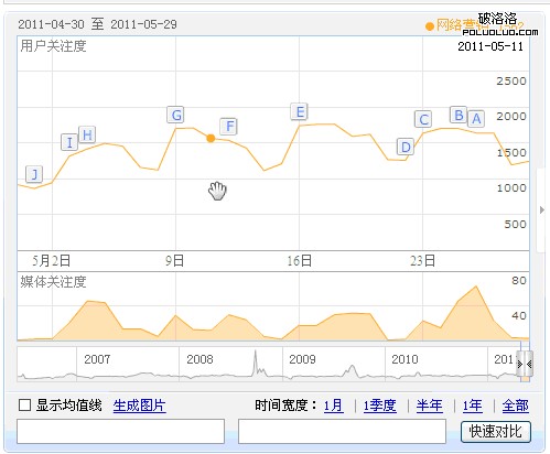 2、百度指數,這個工具顯示它特定關鍵詞的用戶關注度以及媒體關注度。輸入不同的關鍵詞,比較用戶關注度和媒體關注度的數字,從而確定哪個關鍵詞市場需求更大。如下圖,搜索“網絡營銷”,上半部分顯示的是用戶關注度,下半部分是媒體關注度。