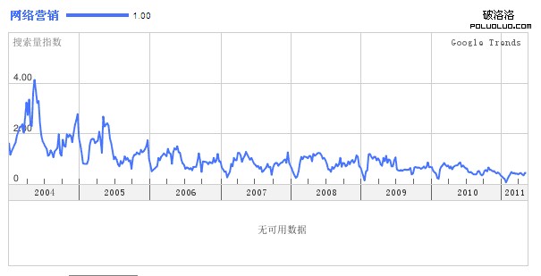 3、谷歌趨勢,和百度指數差不多,同樣是顯示關鍵詞的被關注度,實際上也就是搜索量。輸入“網絡營銷”,如如下圖,趨勢居然是下降的,郁悶了,哈
