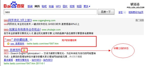 另外為什麼要說能夠有效的對抗SEO呢,首先百度默認優先顯示競價內容,然後就是收藏,最後才是自然排名。當然如果一個搜索當中沒有競價的時候,那麼優先顯示的就是收藏,不管你的網站優化的再好,在首頁的排名第一,那也超不過客戶自己的收藏;還有就是百度可以根據客戶的收藏數據對網站進行排名,當同一類型網站,用戶收藏人數相當多的時候,那麼百度可以默認為該網站的用戶體驗好,用戶喜歡的東西那麼就給最好的排名,當然後一個目的只是我的猜測而已。
