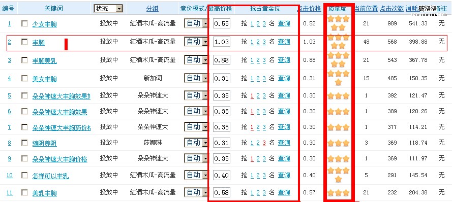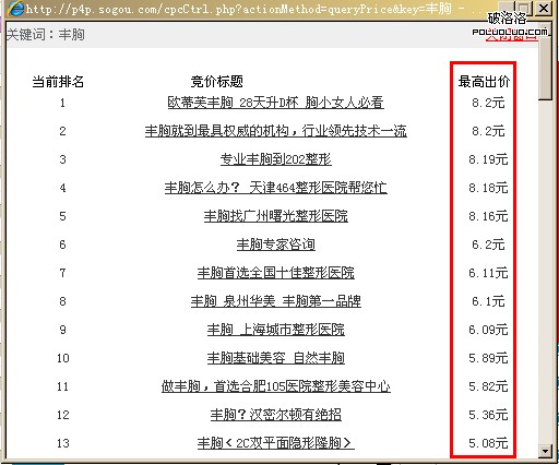 為什麼這樣說呢,從以下圖就可以看到,我出價1.03元這個“豐胸”關鍵詞,排名48,查詢一下,就可以看出,從上至下的排名一目了然,價高者得,創意都是五花八門,有的甚至是幾個字而已。如果是出於各方面的綜合才能給出排名,為什麼排序方面還是以價格為基准呢?