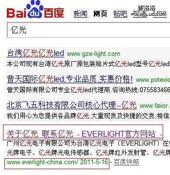 筆者在一家代理億光產品的公司就職。最想做上去的關鍵字可能就是“億光”了。這個詞的競價只有3個,首頁排名中網站是首頁的到蠻多,但是首頁網站的外鏈都不怎麼樣。應該是很好做的一個詞。就在筆者分析排名第一的那個網站時候,發現排名第一的網站標題裡面竟然沒有億光這個詞,但搜索引擎的結果中竟然有這個詞。
