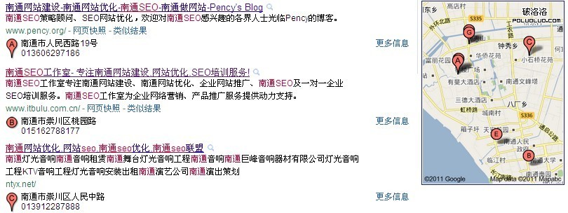 我們搜索任意東西出現在搜索引擎首頁的基本上都是10個網站,而谷歌卻超過了10個,為什麼呢?就是因為谷歌的優惠政策。我們在谷歌的搜索的首頁看到右側有一塊google地圖,上面有A,B,C,D這類的標志。而且每個字母都對於一個首頁的一個鏈接。
