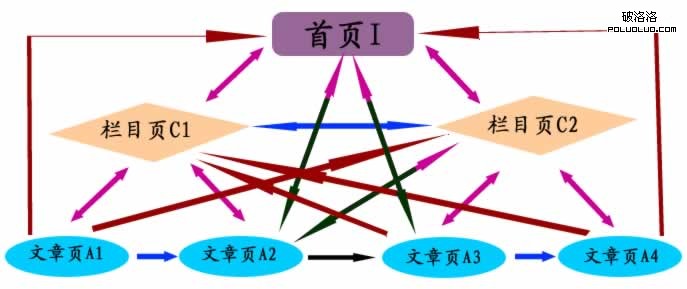 4、每個欄目頁能一次到達所屬文章頁,如圖C1指向A1、A2,C2指向A3、A4。有時某個欄目頁指向另一個欄目頁的所屬文章頁,如圖C2指向A2,可以通過相關推薦實現。