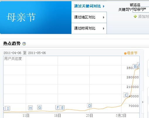 進入五月份這個詞的指數是直線飙升,從70000到140000,再到350000也就一天兩天的時間,早在3月中旬這個詞的指數就達到3000多,可見越來越多的人注重親情的,這些對於我們來說是很值得欣喜的一件事情,另外對於我們站長也要好好把握這個機會,在這個節日大流裡面截取一部分的流量為我所用。今天我要為大家分析的是如何在這個節日裡面利用長尾關鍵詞截取一定的流量。
