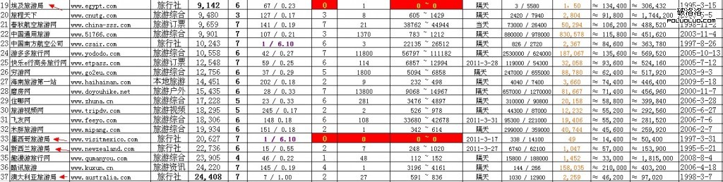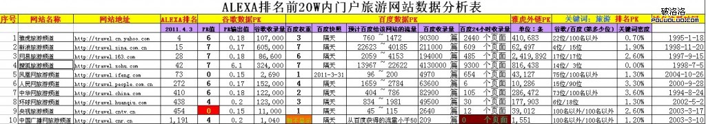 所以我就在專業站點數據參考標准上加了一個反關鍵詞:“旅游”排名。這樣一來就比較容易看出門戶旅游站點之間的龍虎爭霸了,也能同專業站點進行對比分析,如圖: