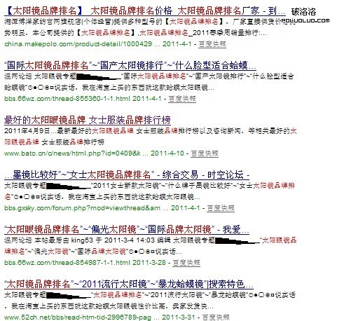 昨天發現一直穩居百度第一的“太陽鏡品牌排名”這個網站竟然一下掉到了11名上,在此之前該關鍵詞的排名一直非常穩定,大約穩定排名一年多,但是一直來該關鍵詞流量卻很少,也就在最近,夏天快來了,搜索該關鍵詞的流量才逐漸多了起來,平均每天從該關鍵詞來的流量在100IP左右。昨天該關鍵詞排名一降,流量直接縮水三分之一之多。看了一下網站其他關鍵詞排名都還沒什麼變化,證明網站不存在被降權的可能,原本以為是百度的偶爾一次失誤所以也沒太在意。今天再來看網站的排名依然還在11名,快照也更新了,仔細看,發現首頁所有一級域名的網站全部都上了第二頁,都緊隨我站排名之後,才證實百度是進行了人工干預排名。