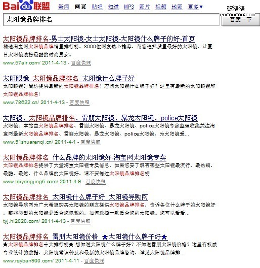 如圖:搜索“太陽鏡品牌排名”百度第1頁顯示的結果: