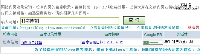 從此圖可以看出,韓寒的博客PR7快照是昨天的,而這個普通的博客呢?同樣是新浪的,但是PR0,快照是27天以前的,為什麼差距如此的大呢?怎麼做能把一個博客也養到如此高的權重呢?(由於另一個博客是公司的,所以沒辦法公開)