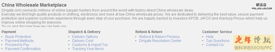 DHgate,這個之前huxingyu分析的比較多。先看它的title:Wholesale - Buy China Wholesale Products from Chinese Wholesalers on DHgate.com