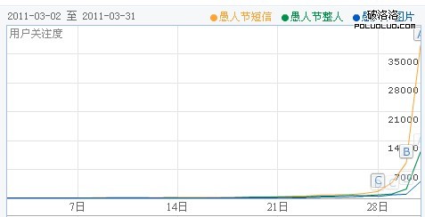 從圖看出,從28日到30日,關鍵詞愚人節短信增長幅度大於其他兩個,我們就可以確定了關鍵詞愚人節短信是用戶搜索的趨勢。
