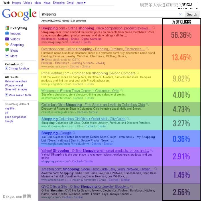 我們可以看出,絕大部分的搜索點擊都在第一頁,而且從第一名到第十名的點擊率依次下降。