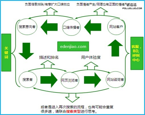 從網站購買完產品之後或者是沒有購買的用戶出來之後,就和網站發生了一定的關系。這個關系是兩個方面的,一個方面是好的,另一個則是壞的。我們可以說他們身上具備了口碑傳播的因子。至於這個因子是正面作用還是負面作用,那就要看這個客戶在這個購買流程中有沒有得到滿足。這個時候,客戶就變成了口碑傳播者,會影響更多的人去搜索相應的信息。然後回到假設前提。在這個層面上說假設的前提是很重要的。下面我們一起來看看SEO在其中的作用。
