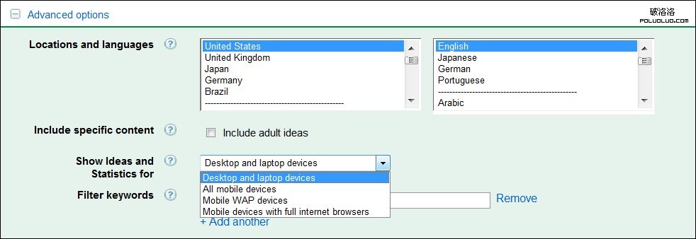 3.點擊關鍵詞框下面的高級選項鏈接,如果你是做跨國市場的,這個功能對你將很有幫助。它可以根據你的選擇顯示不同國家,不同語言的關鍵詞列表。在搜索設備一項,我們可以看到: