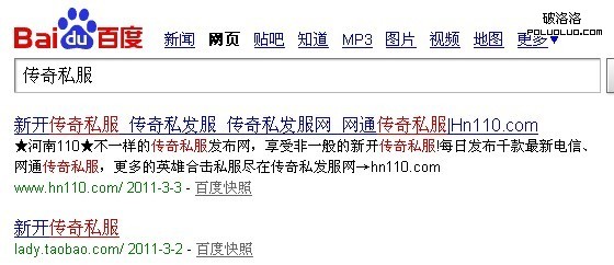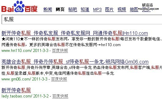 在百度搜索引擎又發生了有趣的事情,搜索“私服”“傳奇私服”“新開傳奇私服”等關鍵詞,淘寶網女人頻道均排在顯赫的位置(見下述圖片|PS:周一早上起來看,發現此現象已經消失!暫不知是為算法改變,還是人工干預)。這個消息在站長圈子裡炸開了鍋,大量的站長朋友對此現象提出了自己的疑問,下面墨明棋妙在此對這個現象做出自己的解釋,也針對性的解答一下比較典型的一些疑問。
