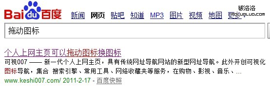 首先我注冊了論壇25個,運氣不錯,有8個可以在簽名檔做瞄鏈接。我將這些論壇的簽名全部設置為“個人上網主頁可以拖動圖標換圖標”的瞄鏈接,然後在每個論壇發帖一個,多為笑話,最後就是靜靜等待百度的收錄了。沒多久,收錄情況不錯,我用“拖動圖標”關鍵詞就能搜出網站了,只是出了點小問題。