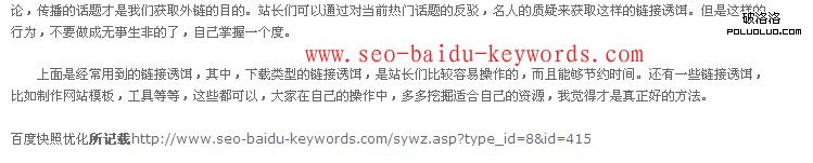 我們SEOER在做網站優化,一般情況下都是用網站的首頁來進行SEO優化,畢競首頁是用戶第一眼能看到的,所以權重相對而言是要高許多,在更新網站內容時,首頁都會顯示最新的內容。這樣能引取搜索引擎蜘蛛的愛戴。更新網站內容時,一般都是以企業的新聞動態來操作,在操作網站資訊文章時,很多SEOER都會在文章的結尾加上網站的主域名。其實我認為這個作法不算最精辟的。我認為最好是加文章正文章的關鍵詞再加文章所在的文件下的全網址為好。這樣可以得到站內內容與內部鏈接的結合。或許我這麼說有些站長會不明白。我傳個效果圖演示給各位看(如圖)