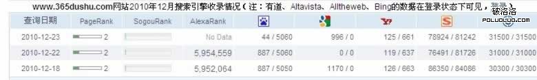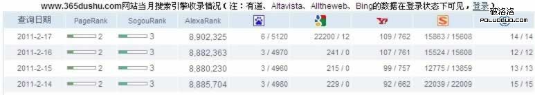 10年12月30日,我的網站轉型和徹底改版,徹底到什麼程度?以前的源碼程序通過FTP全部刪除,一個文件也沒保留。為了得出更精確的測試結果,網站沒做301重定向,只簡單的做了一個404錯誤頁面。網站域名仍然用之前的,但是源碼程序和網站結構全部改變了。通過這一個多月新站收錄的效率和結果,我對各個搜索引擎的反應速度、收錄效率、權重變化等情況進行了總結和比較。下面將具體為大家講解這個過程在各個搜索引擎的變化,讓大家通過我的這次網站改版實戰測試更加了解各家搜索引擎的特點,先上一張圖片,是這個網站改版前各搜索引擎的收錄情況: