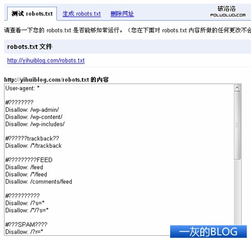 1、指令區分大小寫,忽略未知指令,下圖是本博客的robots.txt文件在Google管理員工具裡的測試結果;