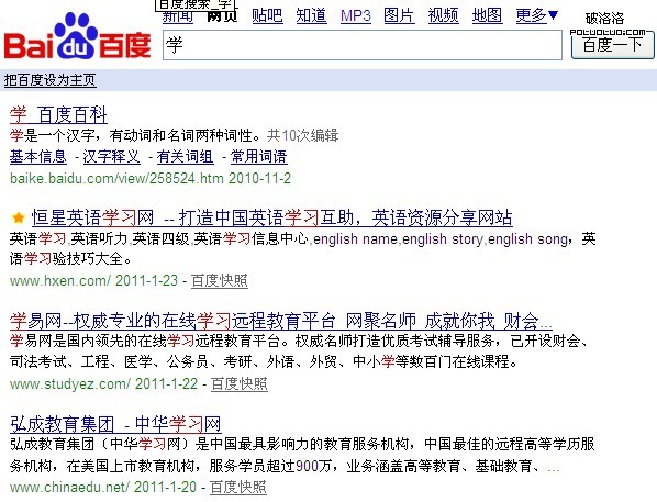 2、基於統計:百度把一個詞標紅的原因:標紅的詞一般是一個關鍵詞,你搜索“學”字的時候,百度它自認的把“學習”也當成了一個關鍵詞,所以出現“學習”這個詞標紅,這就是百度分詞法:基於統計分詞。