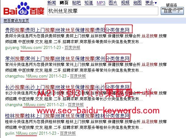 前天我在百度搜索引擎上看到這麼一個網站,它屬於分類信息網站,當我看到搜出來的結果時,結果我很震撼。當你搜“杭州絲足按摩”時,翻到21頁再一直往下翻,一直到30多頁,所看到的結果。你會覺得建信息類的群權必然性。(如圖)