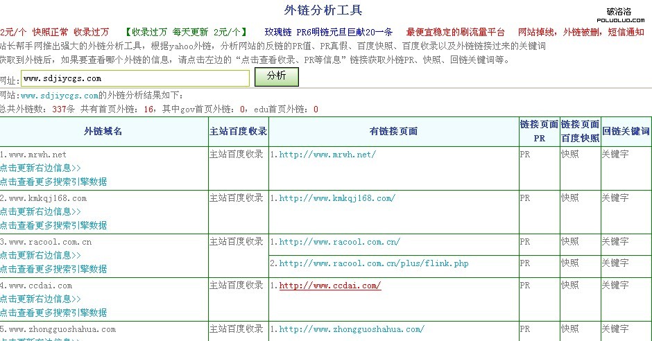通過這個工具,我們找幾個跟我們相關行業的網站,並且排名前五的,進行外鏈分析,我們可查詢到很多網站真正被百度收錄的有效鏈接不超過30%,那為什麼有些網站排名還是那麼好呢?那這個時候就可以看出它的反向鏈接質量是非常好的,雖然有1000個反向鏈接,真正有效的達不到300個,可以看到有些網站做的友情鏈接是全站的,因為有些網站當初的網站結構沒有做好,只要你跟他交換了友情鏈接,他全站就會給你一個鏈接,像這樣的網站是很難找的,其實我們不要茫然的去尋找這樣的網站做友情鏈接,我們只需要分析競爭對手的友情鏈接和反向鏈接,就可以把他有效果的反向鏈接全部拿過來,我們也就可以跟這類型的網站交換友情鏈接。