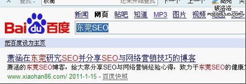 大家可以搜索一下東莞SEO,排在第一位的是蕭涵的博客,他的博客TITLE就跟目前的技術比較接軌,針對百度的分詞就很明確。分析一下: