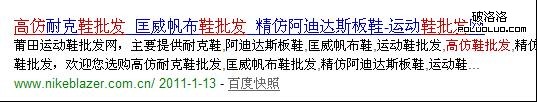 這個網站我已經觀察他很久了。之前認為他蠻小白的,看他網站也沒有什麼仔細的優化,但是查下排名就讓我大驚失色了。於是我決定觀察一下它。這個網站搜索“高仿鞋批發”是排名第二位的。經常在第一位浮動。 這個例子也足夠證明百度分詞不是按照關鍵詞的貼近而決定排名的。