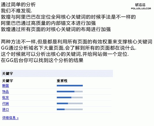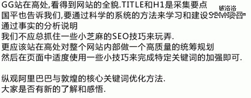 對於一個大型網站來說,全局性的優化和核心關鍵詞的定位尤其重要。光年論壇中之前有一個朋友發了這樣一個帖子《求大俠幫忙解讀網站首頁和各個欄目間的最優布局》通過初步分析,其網站SEO,SEM全局性非常糟糕。雖然頁面中體現出了一些SEO技巧的使用,但是收效甚微。而上面圖片中所分析的內容,恰恰說明了網站內容不少,更新也頻繁,但是為什麼就是排名不理想的一個全局性的症結。我在幫一些朋友做網站規劃和修正的時候,通常先考慮全面的一個定位,而後根據核心定位在對不同頁面和目錄進行設計。