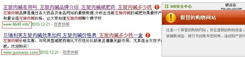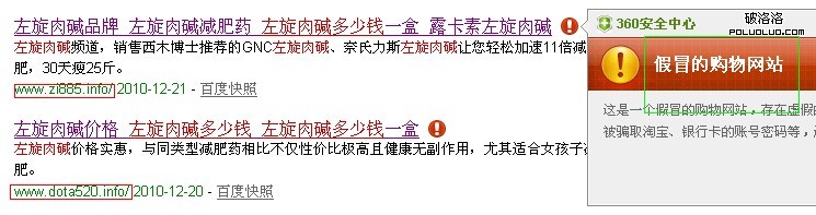 一、 遭舉報------假冒購物網站------.com的對手遭誤殺:相信用360浏覽器的用戶都能看到這些假冒的網站,肯定會左旋哥有所影響。這一切可能是對手的舉報,這一舉措絕對不是空穴來風,左旋哥的威力實在是太大了。在下面的圖我們還可以看得到不是左旋哥的菜.info,就是.com竟然也無故遭到誤殺同樣出現假冒的字樣,可見.info的域名的病毒傳染還蠻快的,人人得而株之的左旋站太可惡了。